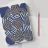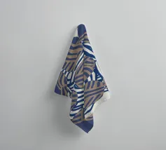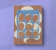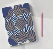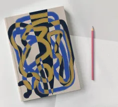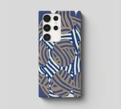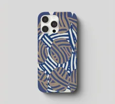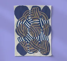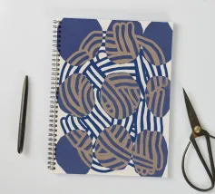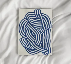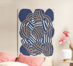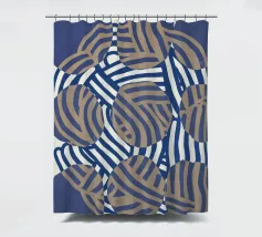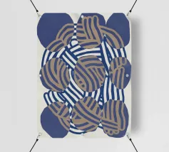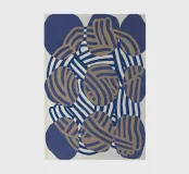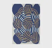 A geometric pattern dominates the frame with intertwining blue and tan stripes creating an abstract design. Circular shapes and curves intersect in a rhythmic composition against a light background, suggesting movement and complexity.