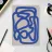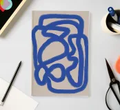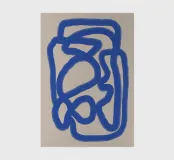 A thick, blue line meanders across a neutral background, creating an abstract pattern with bold, curvilinear shapes. The simplicity of the design emphasizes the movement and flow of the continuous line.