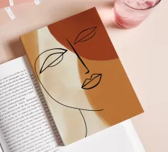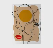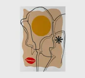 A continuous line drawing creates an abstract face with red lips and a star, overlapping with a sun shape on a textured background, blending minimalism and surrealism.