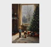 A lovely Christmas motif: a little boy stands in amazement in front of the decorated Christmas tree, surrounded by colourful presents and twinkling lights. Gentle winter light falls into the room through the large window, creating an atmosphere full of warmth, security and festive anticipation. A timeless image of childlike joy and Christmas magic.