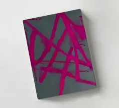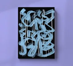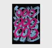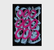 Vivid pink strokes form looped shapes over a background of pale blue paint daubs on a black backdrop. Drips of white paint run down from the thicker accumulations of color, giving a sense of movement to the composition.