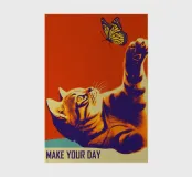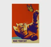 This charming motivational poster combines playful photography with a vintage aesthetic. The intense two-tone colour scheme in bright orange and deep purple is reminiscent of psychedelic screen prints from the 1960s. The curious cat reaching for the monarch butterfly symbolises childlike joy and mindful experience. The slogan "MAKE YOUR DAY" emphasises the positive message without being obtrusive. The posterised image processing lends the work graphic clarity. A statement about joie de vivre, curiosity and finding happiness in small moments - inspiring and decorative.