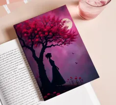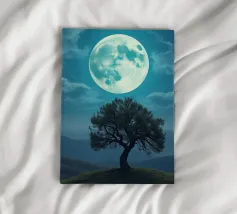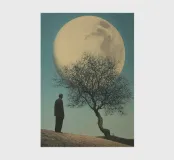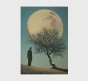 A man standing in front of a tree. The illustration has a soft blue background, a full body shot from a low angle and is characterised by surrealism, retro poster style, pop art, vintage, pastel colours and a minimalist design.