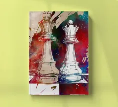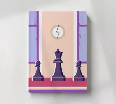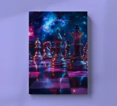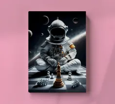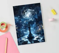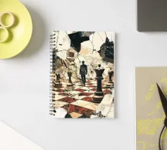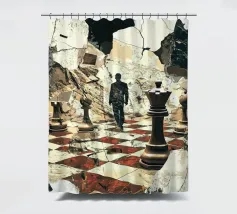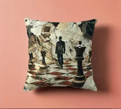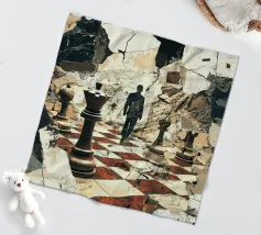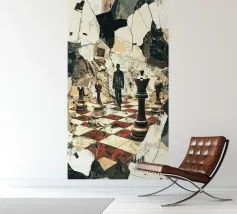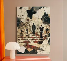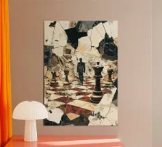 A mysterious man strides through a chessboard broken by rubble, flanked by oversized chess pieces. The surreal image combines classical symbolism with modern abstraction: strategic considerations meet chaos, order meets destruction. The cracked surroundings suggest an inner or outer collapse, while the man's path between the figures looks like a metaphorical decision-making process. Ideal for thinkers, strategists or art lovers with a penchant for psychological depth and visual ambiguity.