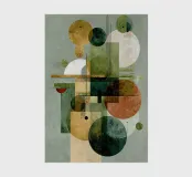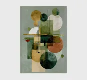 An abstract Bauhaus-inspired dance of circles and rectangles in earthy matcha greens, soft cream, warm ochre, and deep rust. This geometric composition evokes the ritual of balance — like the layering of flavor in a crafted drink or the architecture of clarity in design. A perfect statement for modern, minimalist, or mid-century styled spaces.
