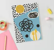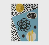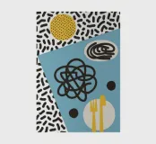 An abstract composition in the Memphis style, featuring playful squiggles, geometric shapes, and patterns in a cool palette of blue, black, and white, with a pop of yellow.