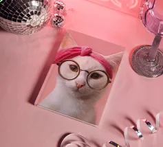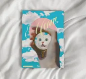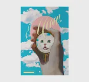 Human slowly transforming into a white fur cat, seeing themselves in a pocket mirror for the first time (with their kitten whiskers and cat eyes). Surreal funny typographic collage art by MsGonzalez