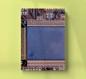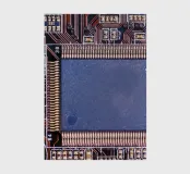 This technical macro image shows a microprocessor embedded in a highly complex circuit board with numerous electronic components. In the centre is the square processor housing, whose fine pins are precisely connected to the circuit board below. Copper tracks run systematically across the entire surface and connect various components such as resistors, capacitors and IC elements. Particularly noteworthy are the rectangular resistors labelled "330", which appear in carefully arranged groups.