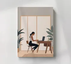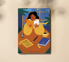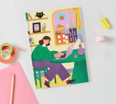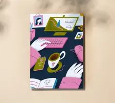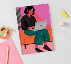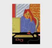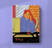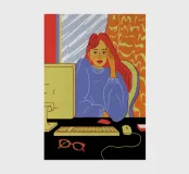 A contemporary illustration of a woman with vibrant red hair working at her computer in a dimly lit room. The glow from the screen illuminates her face and blue shirt. The scene captures a moment of focus and late night productivity, with personal items like glasses on the desk.