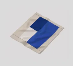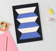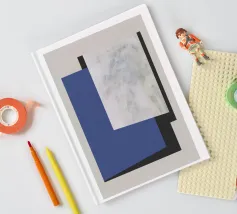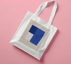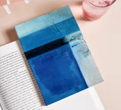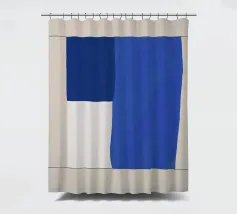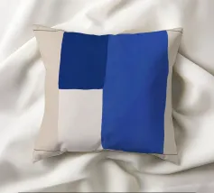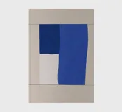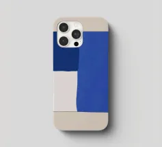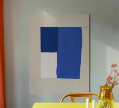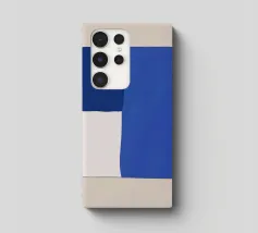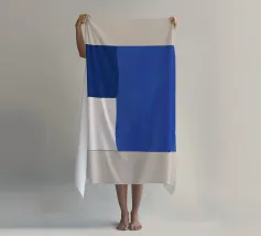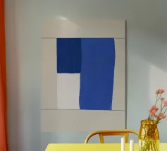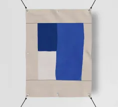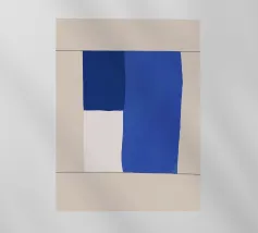 A minimalist composition features bold blue and white rectangles set against a neutral background. The contrasting colors create a striking geometric pattern.