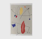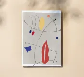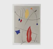 Abstract shapes and lines create a dynamic composition with a neutral background. Bold colors like red, blue, and yellow are dispersed across the piece, connected by sweeping black lines.
