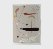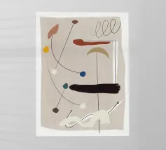 Abstract lines and shapes are scattered across a pale background, creating a dynamic composition with curves and geometric elements. A mix of earthy and primary colors adds contrast and interest to the design.