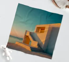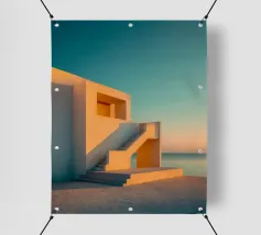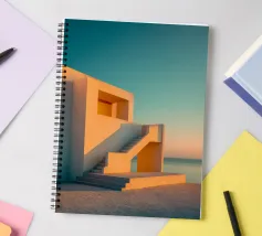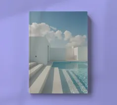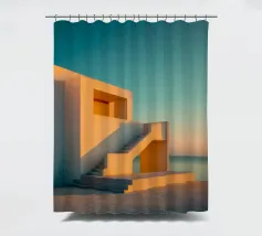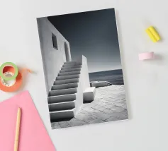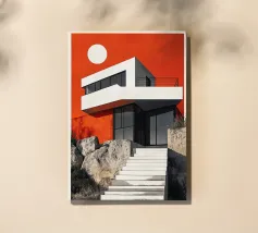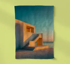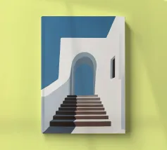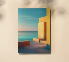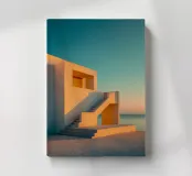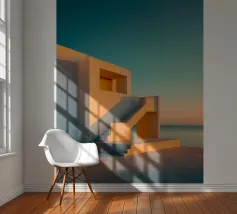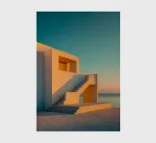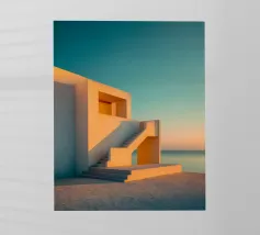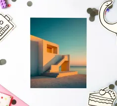 Invite the softness of the Mediterranean into your home with this design poster illustrating a modern staircase, bathed in golden light, against a backdrop of calm sea and pastel sky. Clean lines, graphic volumes and a poetic atmosphere make this visual a perfect choice for inspiring, contemporary decor. Ideal for a living room, office or bedroom.