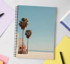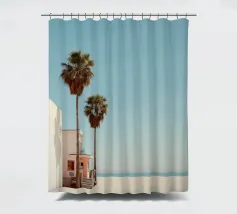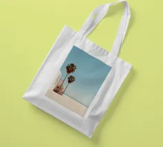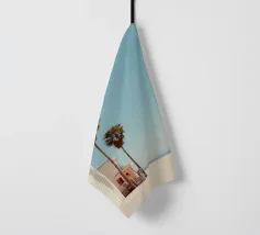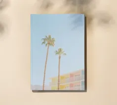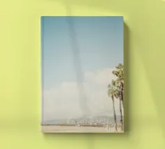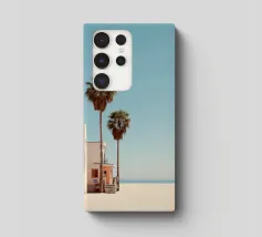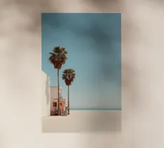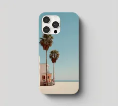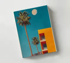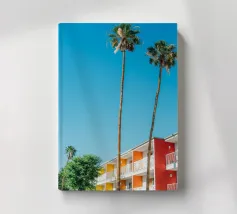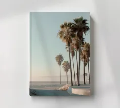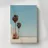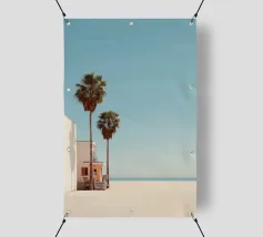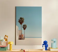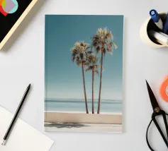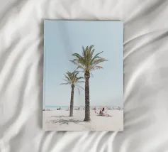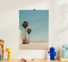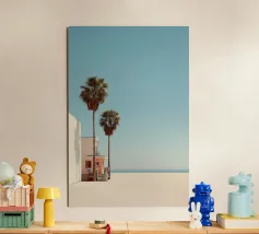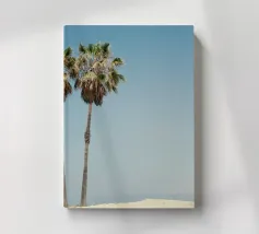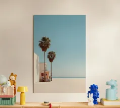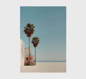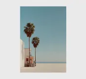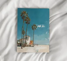 Capture the relaxed vibe of a coastal day with this minimalist artwork featuring tall palm trees and a subtle building on a wide sandy beach.