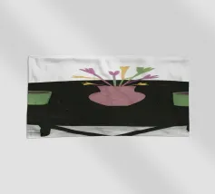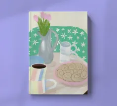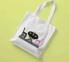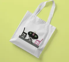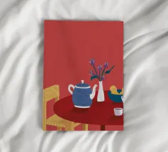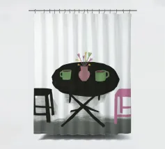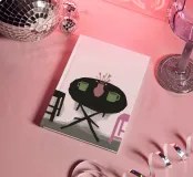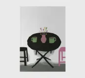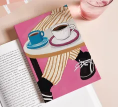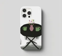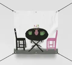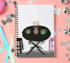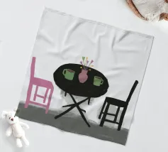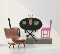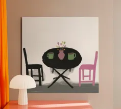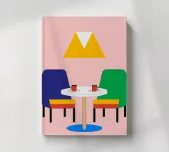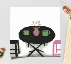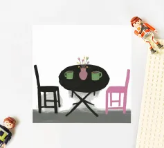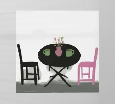 A minimalist illustration of a small cafe table with two chairs, one black and one pink. The simple, clean composition evokes a sense of quiet intimacy and modern romance.