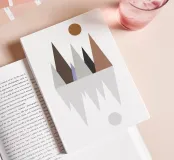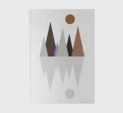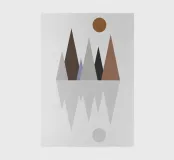 Geometric shapes form a minimalist mountain landscape with a circle above resembling the sun. An inverted reflection of the peaks is depicted below, creating a symmetrical design.