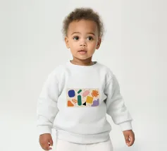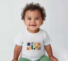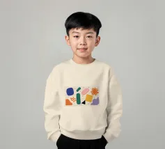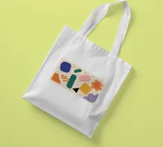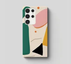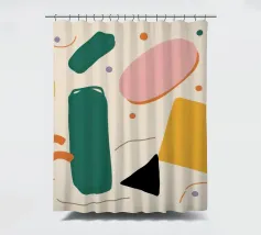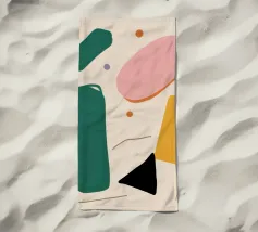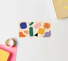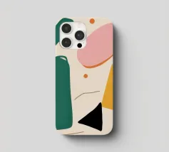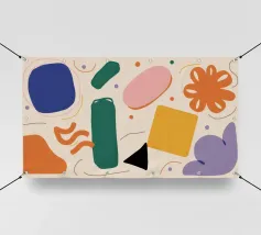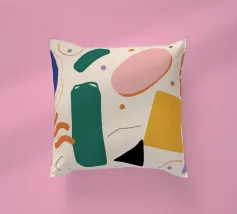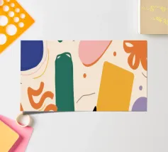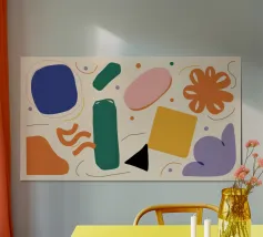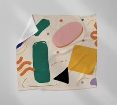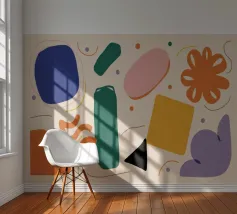 A simple and clean pattern of abstract, rounded shapes in a playful color combination of blue, orange, and terracotta against a beige background.