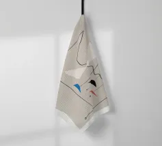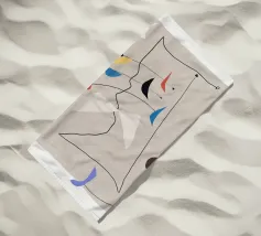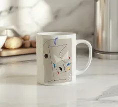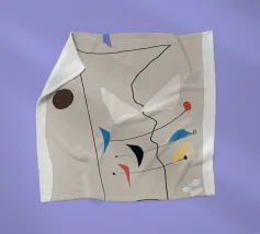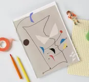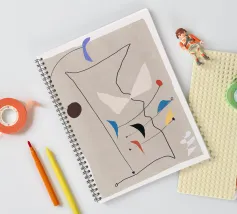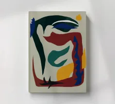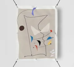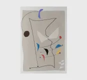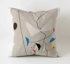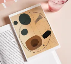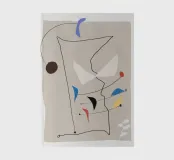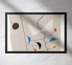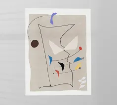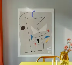 Abstract shapes and lines create a playful composition against a muted background, featuring a variety of colors and curved elements. The design evokes a sense of movement and balance, drawing the eye across its organic forms.
