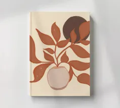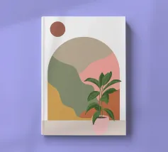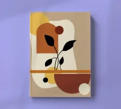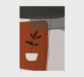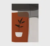 A minimalistic design features a simple potted plant with dark leaves set against abstract, overlapping shapes in earthy tones of red, gray, and white. The clean lines and bold color blocks create a modern, calming aesthetic.