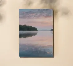 Gentle fog blankets the still surface of a serene lake as sun rays begin to illuminate the landscape, highlighting the surrounding trees at dawn.