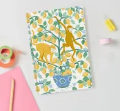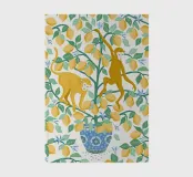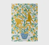 Playful monkeys climb lemon tree set in chinoiserie ginger jar. A whimsical, colourful design that brings a fresh and lively touch to any room.