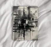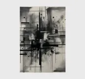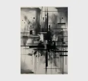 A Monochrome Abstract Art - Suite of 2 pieces called Chaos and Structure - this is piece 1 of 2. Stark black lines, intersecting grids, and scattered ink splatters converge in a central explosion of energy, drawing the viewer inward. Layers of smoky gray washes soften the geometry, creating depth and atmosphere, while sharp linear elements impose order over fluid motion.