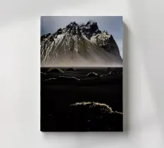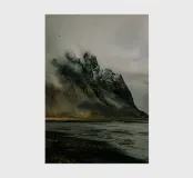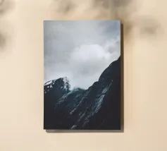 The rugged peaks rise above the mist like ancient guardians, their silhouettes softened by the swirling fog. Wisps of clouds drift lazily across the sky, casting fleeting shadows over the ridges and valleys. In the distance, sunlight pierces through the cloud cover, illuminating parts of the mountain with a golden glow, while the rest remains shrouded in a mysterious, ethereal haze.