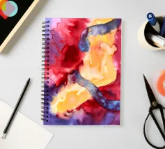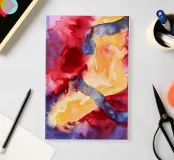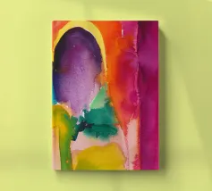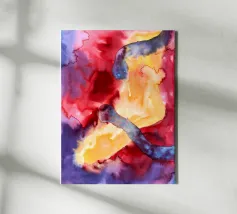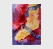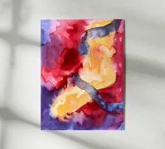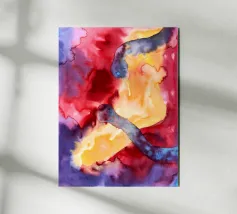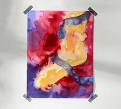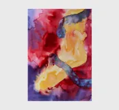 etween Movement and Instinct is an abstract watercolor where flowing forms reveal a hidden scene — a leg intertwined with two serpentine shapes. The composition blends body and motion, instinct and transformation. Warm reds and yellows contrast with cool blues, creating a vivid tension between energy and calm. A poetic piece that invites reflection on intuition, power, and renewal.