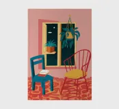 A person sits on a wooden chair in a cozy pink room, gazing out the window at the night sky. The scene is peaceful and introspective, with a hanging plant adding a touch of nature to the calm interior setting.