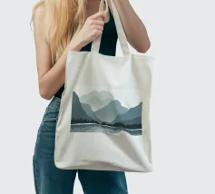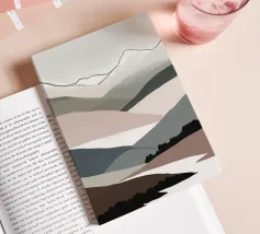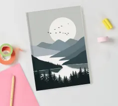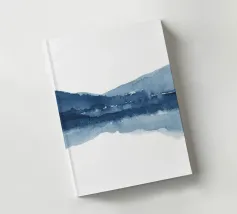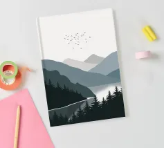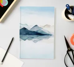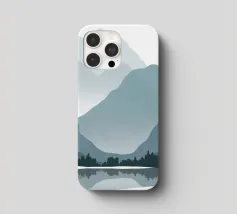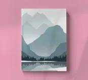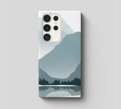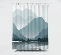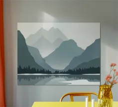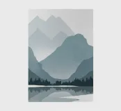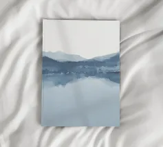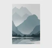 A serene landscape features a range of mountains in varying shades of blue and gray, reflected in a calm body of water. Silhouetted trees line the lakeshore, adding depth to the tranquil scene.