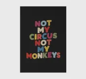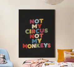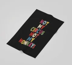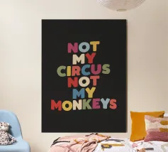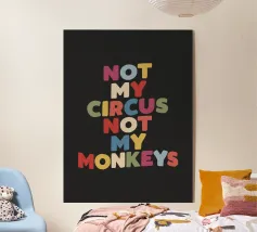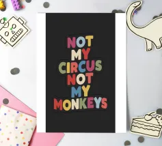 Bring a splash of personality and humour to your space with this vibrant typography art print. Featuring the phrase “Not My Circus Not My Monkeys” in hand-drawn purple, blue, yellow, beige, red, and green lettering on a bold black background, this design is perfect for those who appreciate wit and colour. Its playful yet stylish aesthetic makes it a standout piece for your home office, living room, or creative studio. A great gift for friends or family who love quirky, relatable designs, this print adds charm and a touch of fun to any modern interior.