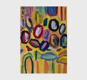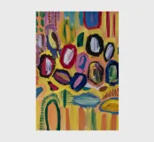 Rows of repeated U-shapes and dots in earthy yellows, oranges, blues, and greens evoke the feeling of a patterned grove or field in this intricate abstract work.
