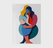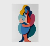 A stylized abstract composition features overlapping shapes in vibrant colors, forming the impression of a seated person. The bold use of blue, red, orange, and teal creates a dynamic sense of movement and form.