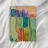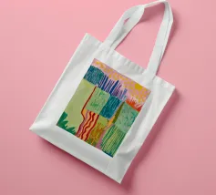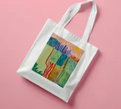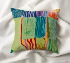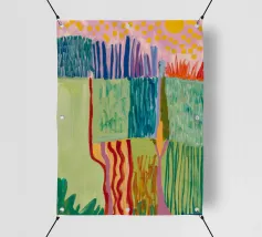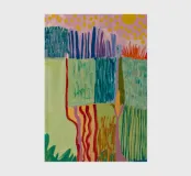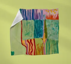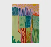 An abstract artwork resembling a patchwork quilt, with distinct rectangular sections of color: blue and white vertical stripes, solid green, and a light yellow-green, possibly representing a stylized coastal landscape.
