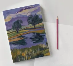 An expansive panoramic landscape depicting a rich tapestry of rolling hills in diverse shades of green, yellow, and subtle purple, marked by patches of trees and cultivated fields, all under a soft, sweeping cloudy sky.