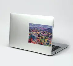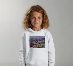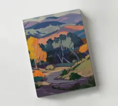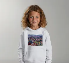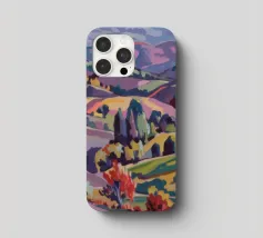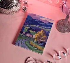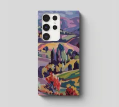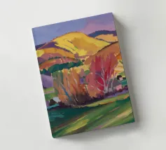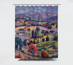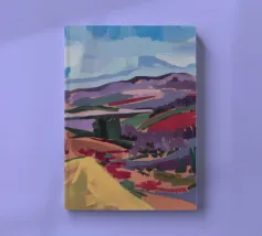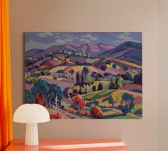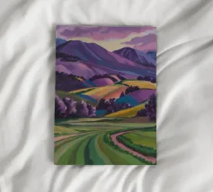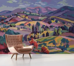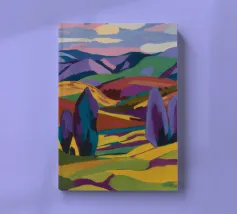 An expansive panoramic landscape depicting a rich tapestry of rolling hills in diverse shades of green, yellow, and subtle purple, marked by patches of trees and cultivated fields, all under a soft, sweeping cloudy sky.