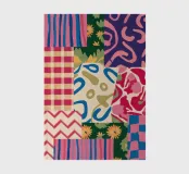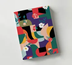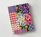 An abstract pattern combines patchwork-like color blocks with energetic scribbles and stripes, creating a dynamic, playful, and artistic design.