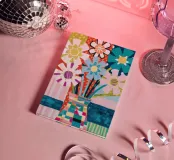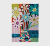 A vibrant bouquet of colorful flowers is arranged in a vase decorated with a patchwork of different patterns, creating a unique and artistic floral still life.