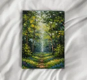 Step into a sun-dappled dream with this stunning impressionistic oil painting. Created with a dynamic palette knife technique, this piece brings a vibrant, three-dimensional texture to life. A winding path draws the eye deep into a lush forest, where towering trees with rich, textured bark form a natural archway. Sunlight streams through the canopy, illuminating the vibrant green and yellow leaves, creating a sense of hope and discovery. The foreground is a tapestry of wildflowers in brilliant blues, purples, and yellows, inviting you to wander into this serene and magical landscape. This artw