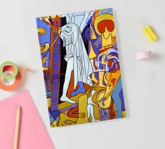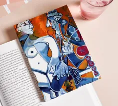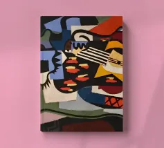 This complex Picasso-esque print features an abstract composition with fragmented human and animal forms, notably a bird and elements resembling a face and hands. Rendered with bold lines and a striking palette of blues, grays, and oranges, the artwork evokes a sense of dynamic motion and deconstructed reality. The interplay of geometric shapes and organic curves creates a thought-provoking visual narrative, characteristic of Cubist and Surrealist influences. This high-quality digital poster (7000x5000 pixels, 300 dpi) magnificently captures the intellectual depth and artistic genius of the or