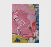 An abstract composition with distinct blocks of color � pink, yellow, blue � combined with white outlines and patterned blue and white lines, reminiscent of a playful, deconstructed playground or vibrant architectural elements.