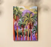 A grove of palm trees is depicted in an abstract, prismatic style, with vertical stripes of vibrant, illuminated color purples, pinks, and yellows creating a highly energetic and modern tropical scene.