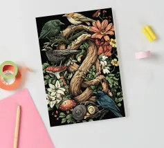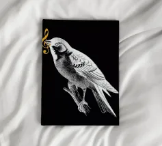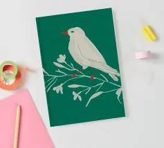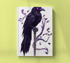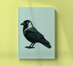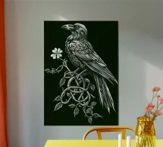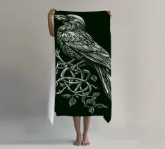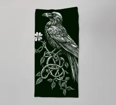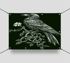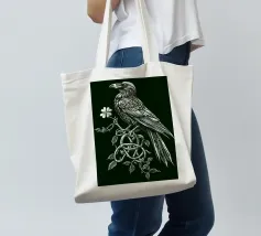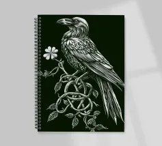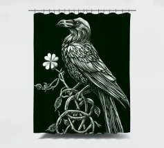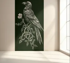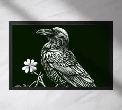An elegant raven with realistic proportions sits on a curved branch and holds a shamrock. The dark green background emphasises the depth of the motif.