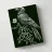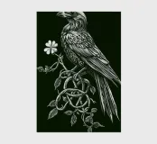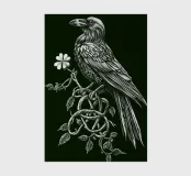 An elegant raven with realistic proportions sits on a curved branch and holds a shamrock. The dark green background emphasises the depth of the motif.