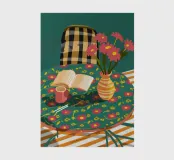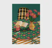 A cozy interior scene of a person reading a book at a table with a vase of flowers, seated on a green checkered chair, creating a peaceful, homey atmosphere.