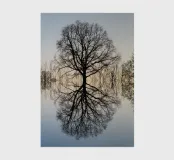 The fine branches and twigs of a tree appear as a dark silhouette against the blue sky. Their reflection creates elegant structures and a complex network of branches. An abstract dreamscape of air, light and shadow becomes visible. This symmetrical composition is dedicated to the timeless beauty of trees in winter.