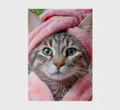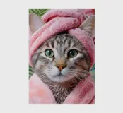 Treat yourself to this adorable portrait of a cat dressed in a cozy pink robe and matching towel, radiating ultimate relaxation vibes. Set against a tropical background with lush greenery and pink hibiscus flowers, this charming photo is perfect for spa-themed projects, pet lovers, or creative content. This delightful image showcases the purr-fect combination of elegance, fun, and feline charm.