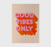 Start your day with positive energy! This "Good Vibes Only" typography art print features retro-inspired lettering in vibrant pink and orange hues, popping against a soft peach background. It's a cheerful reminder to embrace good vibes and positivity in your space. This print adds a touch of retro charm and uplifting energy to any room. By showmemars