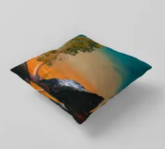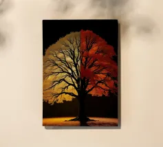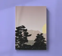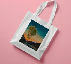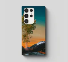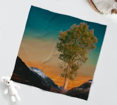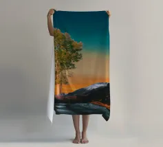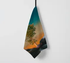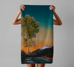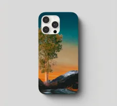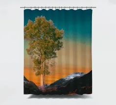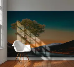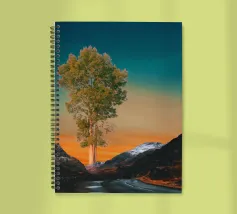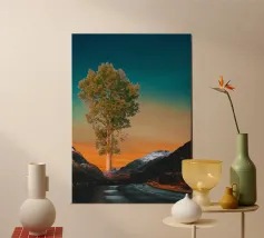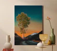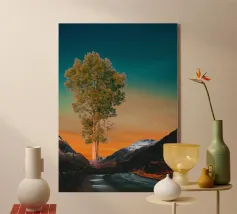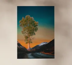 A winding road leads through a mountainous landscape, with a large tree standing prominently in the center. The sky transitions from a deep teal to a warm orange near the horizon. Mountains flank the road on either side, some with snow-capped peaks. The road surface appears wet, reflecting the ambient light. The overall mood is serene and picturesque, capturing the beauty of nature.
