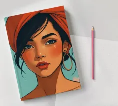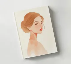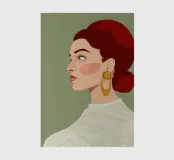 This highly elegant profile portrait showcases a woman with rich, ruby red hair meticulously styled into a bun. Her thoughtful, serene gaze, coupled with a simple gold earring against a soft green background, creates a timeless aura of classic beauty and sophistication.